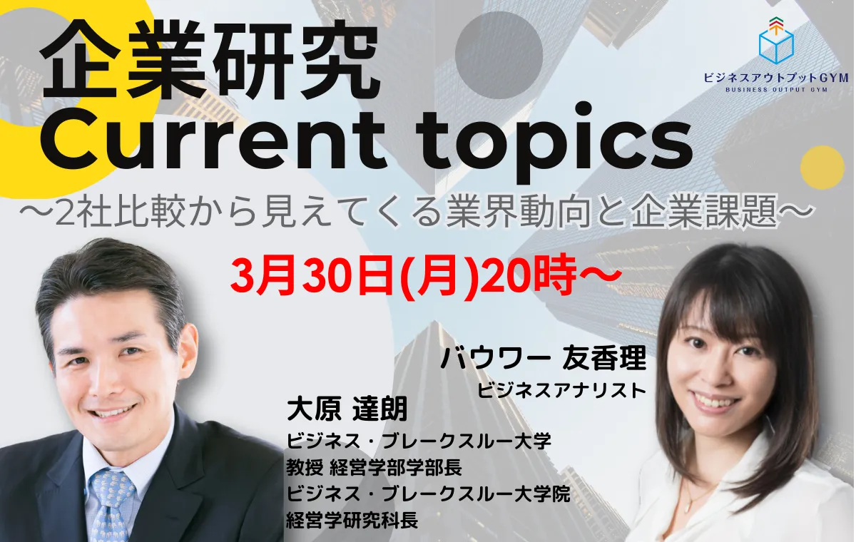 企業研究Current topics ~2社比較から見えてくる 業界動向と企業課題~ インストラクター 大原 達朗 ビジネス・ブレークスルー大学 教授 経営学部学部長 ビジネス・ブレークスルー大学院 経営学研究科長 バウワー 友香理 ビジネスアナリスト | 業界の2社の最新事情を比較し企業課題を浮き彫りにすることで、その業界動向を深く理解することができます。本セッションは、会社HPやウェブ記事などのオープン情報を基に、その企業と業界に今、何が起きているのか。2社比較し、両社の業績の差を分析しながら、その業界の成功要因を講師と共に読み解きます。企業の先行きを予測したうえで、アクションすべきことは何かを明らかにしていきます。 【Zoomウェビナーでの開催(受講生の皆様はチャットで参加)】 |