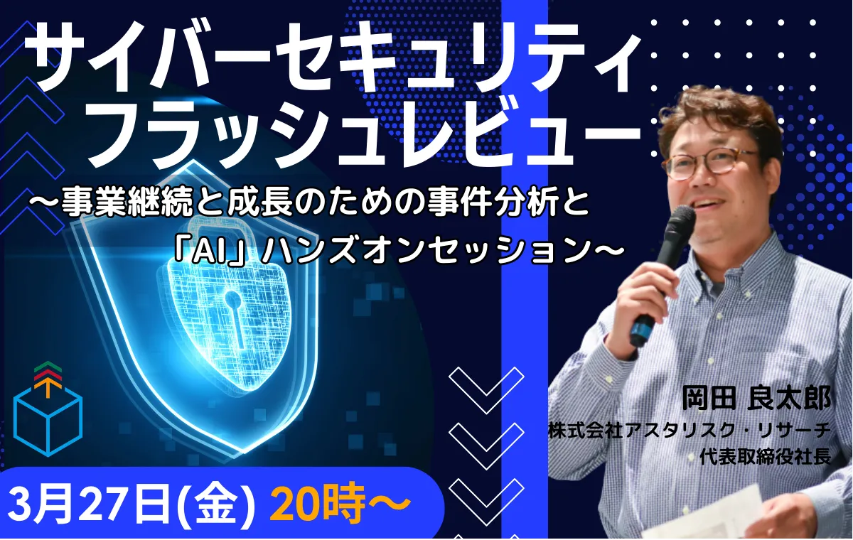 サイバーセキュリティ・フラッシュレビュー ~事業継続と成長のための事件分析と「AI」ハンズオンセッション~ インストラクター 岡田 良太郎 株式会社アスタリスク・リサーチ 代表取締役社長 |