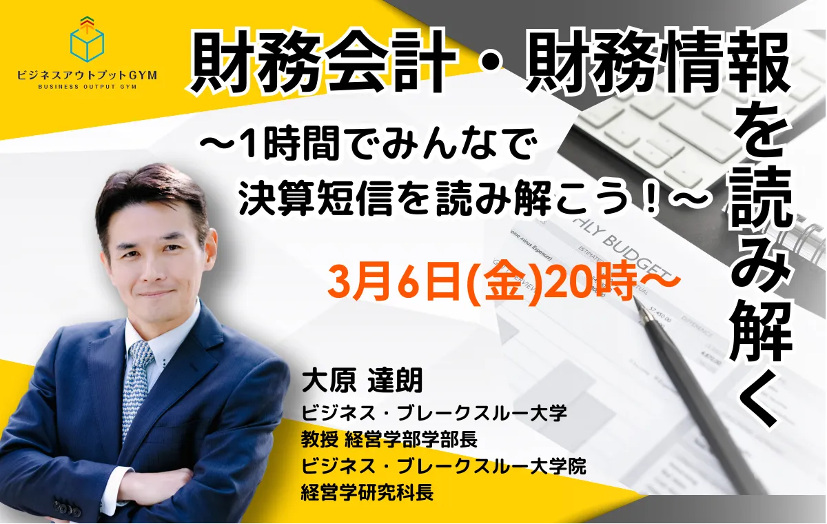 会社の課題を見つけるには、財務情報をきちんと読み解く力が必要です。本セッションは、60分で決算短信が読み解けるようになるためのトレーニングです。 公認会計士の資格を持ち、様々な団体で代表を務める財務のスペシャリストである大原 達朗インストラクターと一緒に、当日提示される企業の決算短信を1時間で読み解きます。本セッションは基本のインプット講義はありませんが、実際に決算短信を1時間で読み解くことで財務情報を読み解く力をレベルアップさせていきます。 ※先月とは別の短信を利用します。 【Zoomウェビナーでの開催(受講生の皆様はチャットで参加)】 |