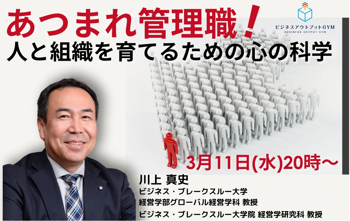 あつまれ管理職! 人と組織を育てるための心の科学 インストラクター 川上 真史 ビジネス・ブレークスルー大学 経営学部 グローバル経営学科 教授 ビジネス・ブレークスルー大学院 経営学研究科 教授 |